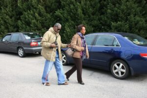 woman guiding gentleman with white cane